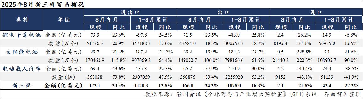 据界面智库和瀚闻资讯统计,2025年1-8月,我国“新三样”进出口总额1120.3亿美元,同比增长13.8%。其中,出口1078.0亿美元,同比增长16.3%;进口42.4亿美元,同比下降27.2%。8月当月,我国“新三样”进出口总额173.1亿美元,同比增长30.5%,环比增长9.8%。其中,出口166.0亿美元,同比增速加快6.8个百分点至34.3%,环比增速加快0.6个百分点至9.6%;进口7.1亿美元,同比下降21.8%,环比增长14.3%。