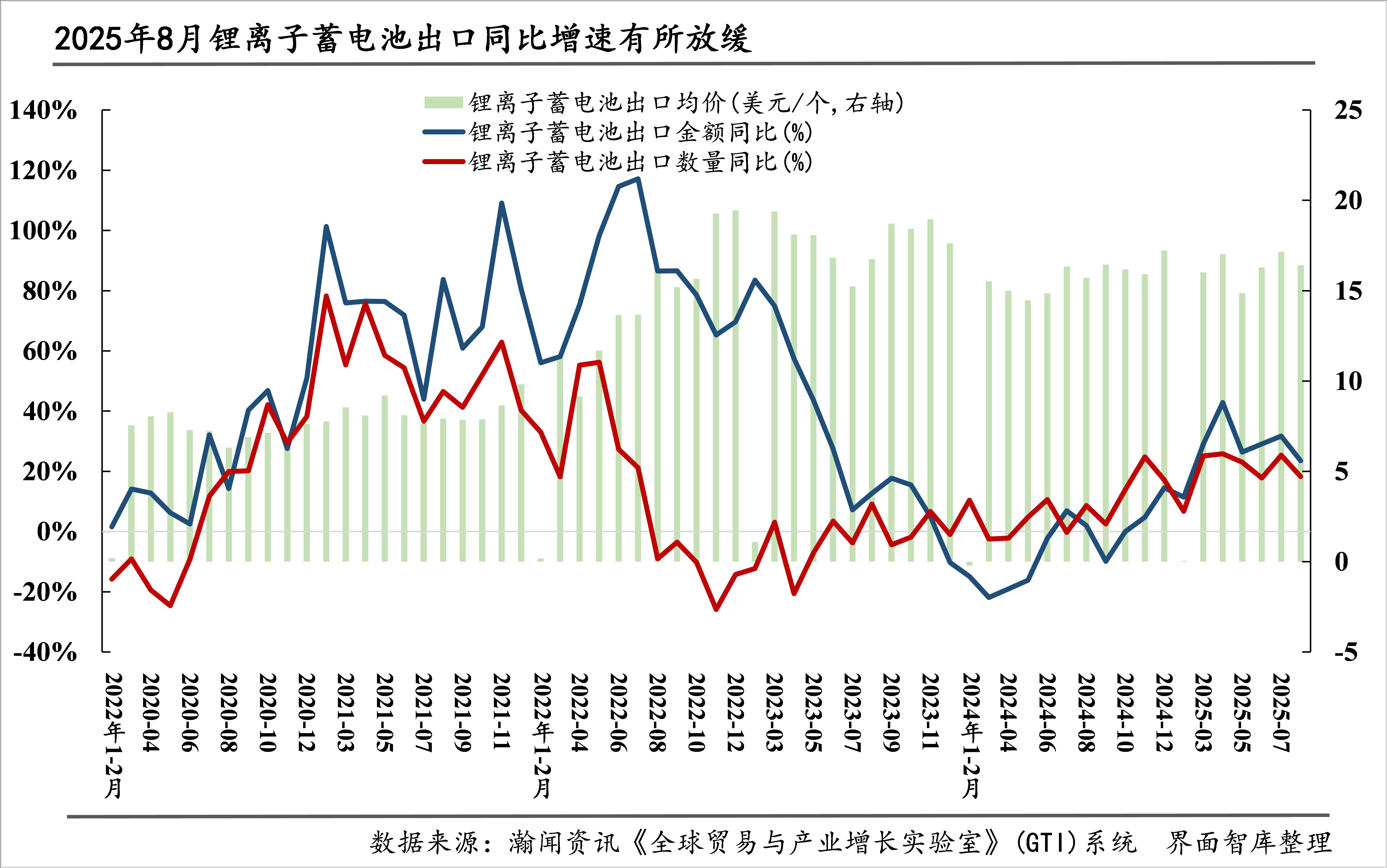 锂离子蓄电池出口同比增速放缓。8月,锂离子蓄电池出口数量环比增长6.1%;同比增长18.3%,较7月放缓7.1个百分点,较上年同期加快9.6个百分点;出口均价为16.4美元/个,环比下降4.3%,同比增长4.5%;出口金额为70.5亿美元,环比增长1.5%;同比增长23.5%,较7月下降8.2个百分点,较上年同期加快21.5个百分点。