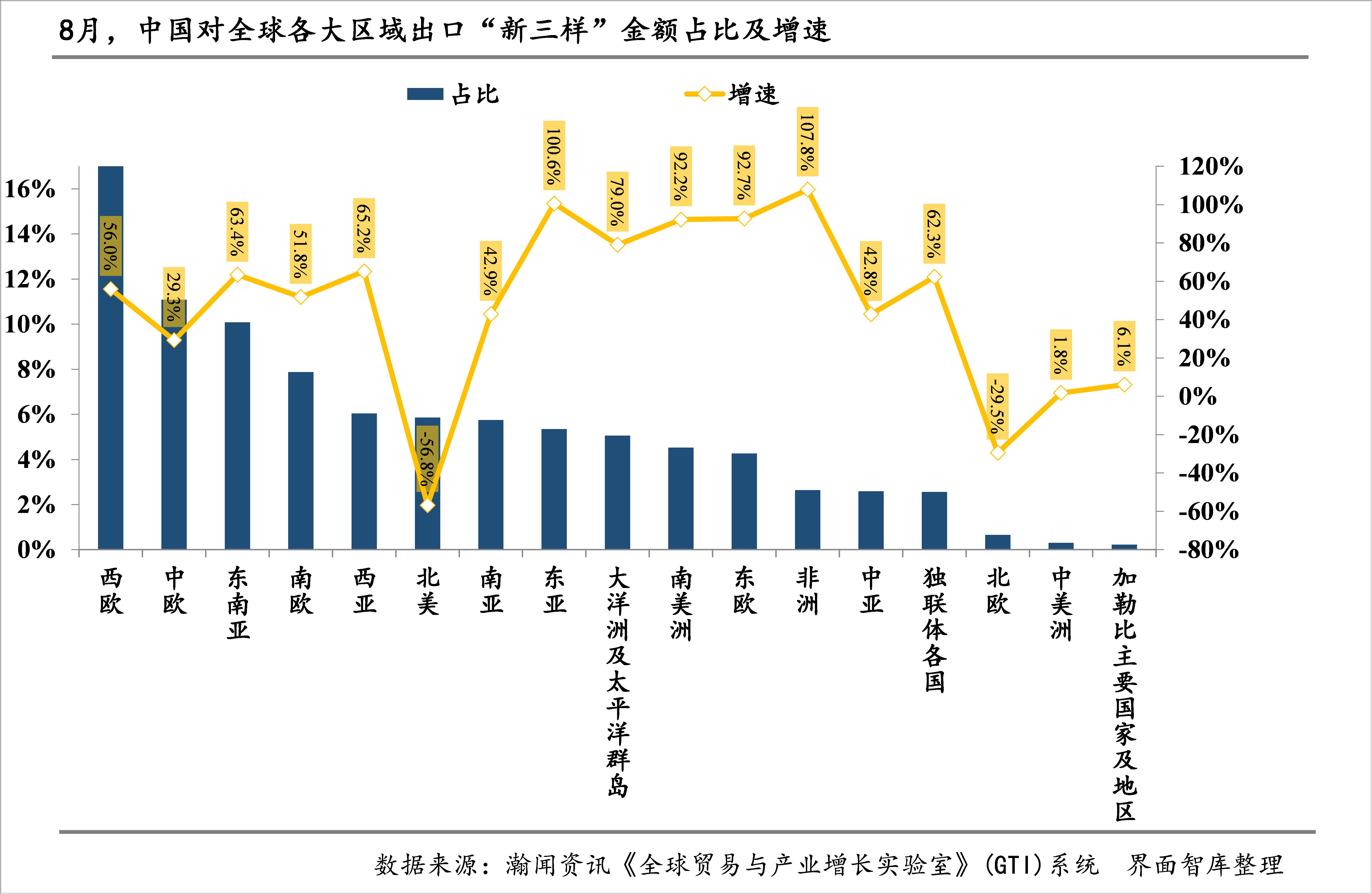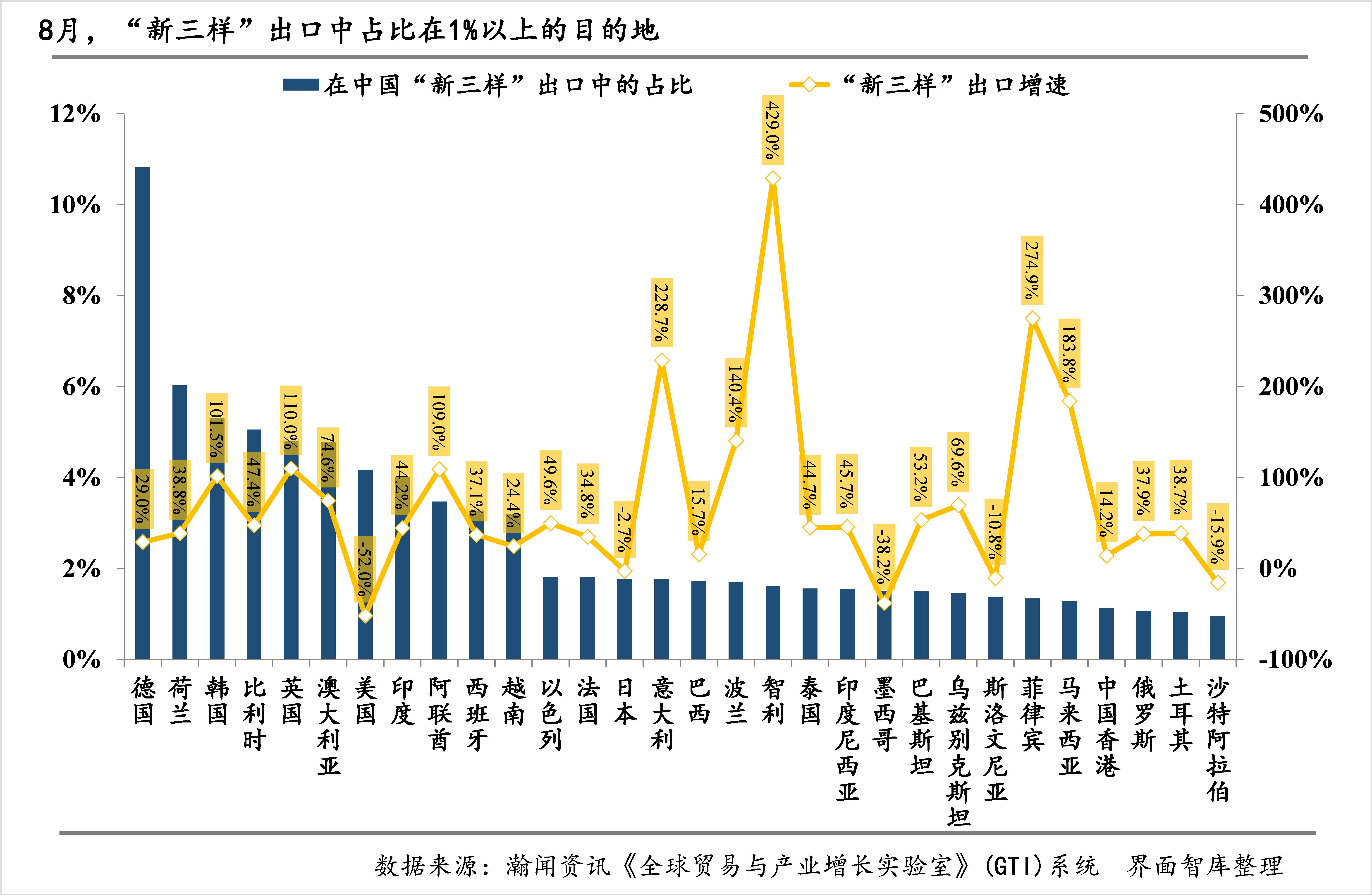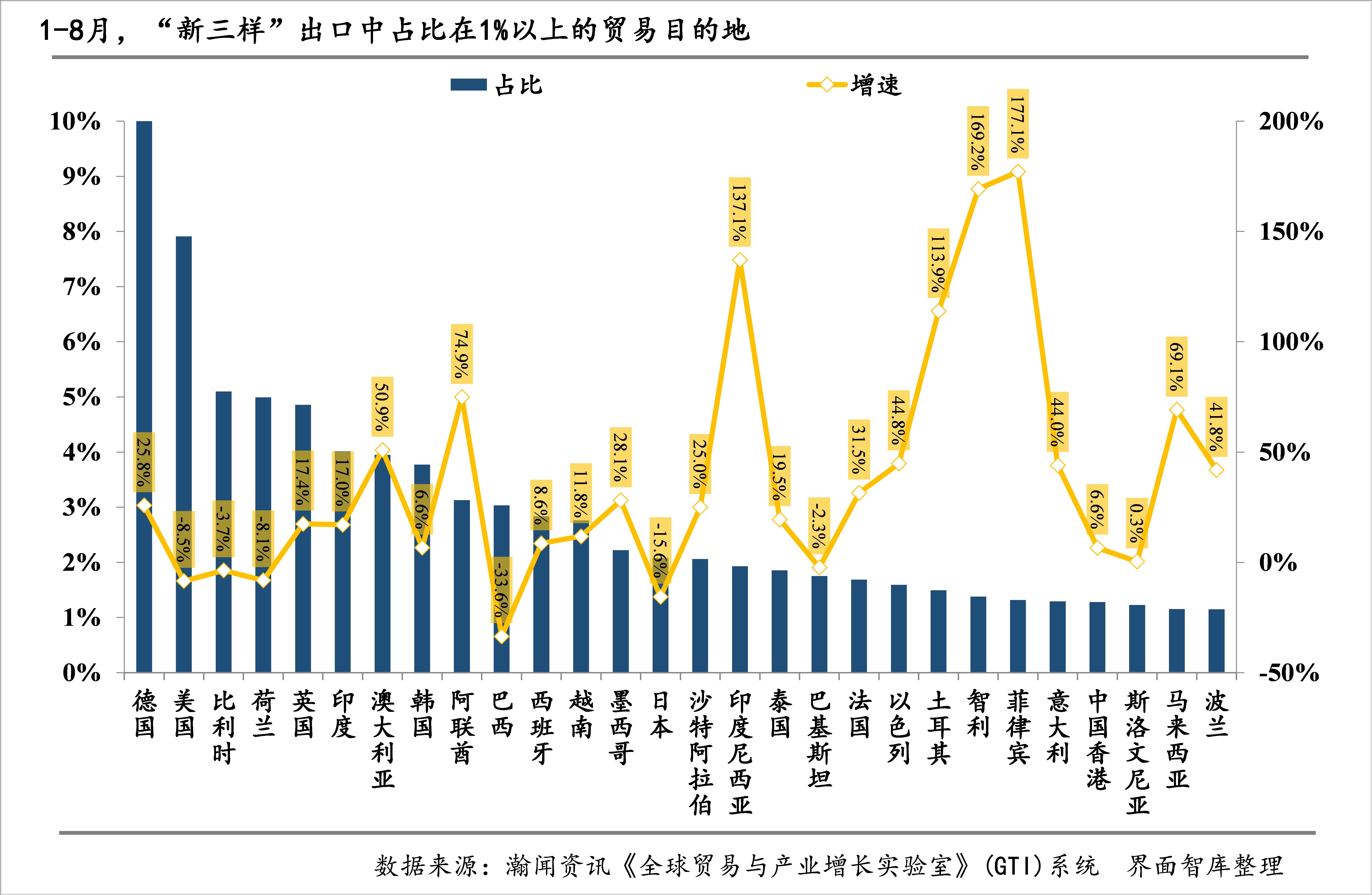 对1-8月“新三样”出口同比增长贡献最大的目的地依次是德国、阿联酋、澳大利亚、印尼、智利,分别拉动“新三样”出口同比增长2.39、1.56、1.55、1.30、1.01个百分点。