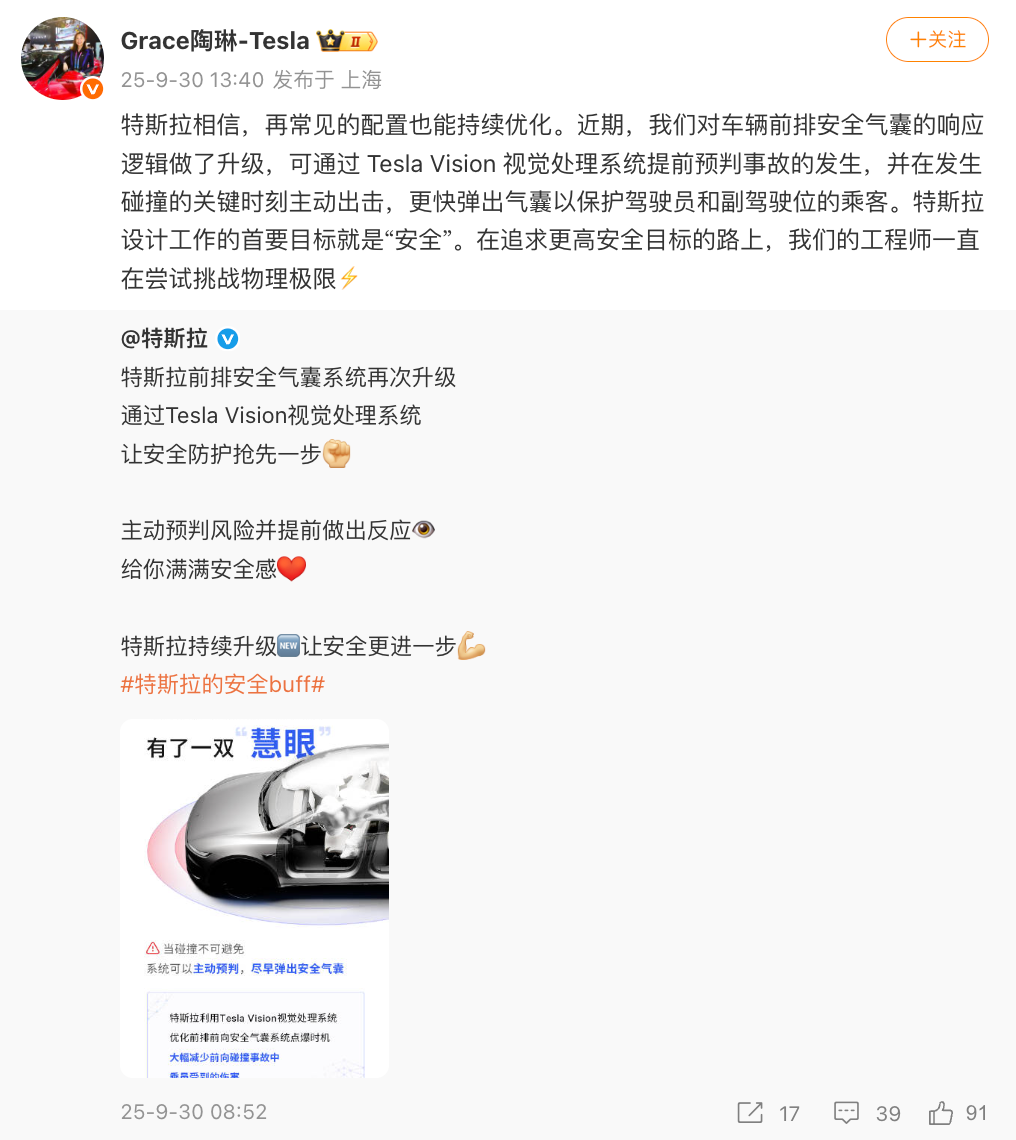 9月30日,特斯拉公司全球副总裁陶琳在社交平台发文称,“近期,特斯拉对车辆前排安全气囊的响应逻辑做了升级,可通过Tesla Vision视觉处理系统提前预判事故的发生,并在发生碰撞的关键时刻主动出击,更快弹出气囊以保护驾驶员和副驾驶位的乘客。”