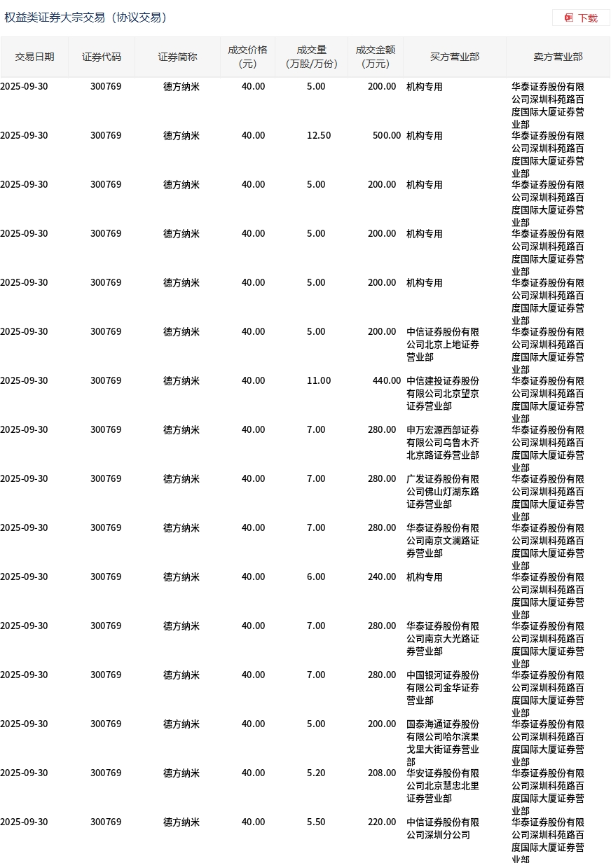 9月30日,德方纳米大宗交易成交105.2万股,成交额4208万元,占当日总成交额的1.96%,成交价40元,较市场收盘价46.31元折价13.63%。