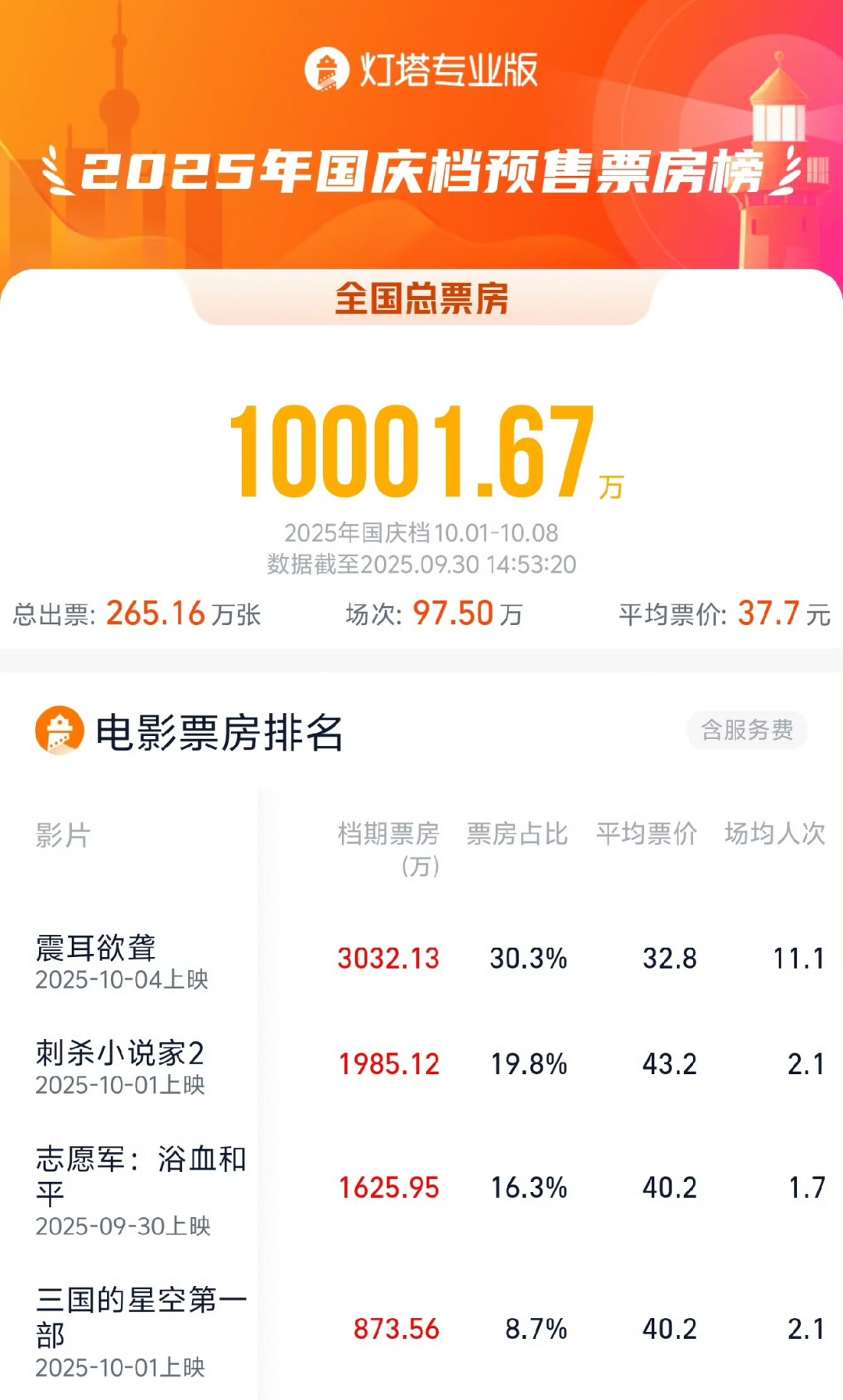 具体来看,预售期表现最强的影片是檀健次主演的反诈题材电影《震耳欲聋》,开启预售不到24小时即突破1000万,截至9月30日14:53,预售票房达3032万,稳居国庆档新片预售榜首位。