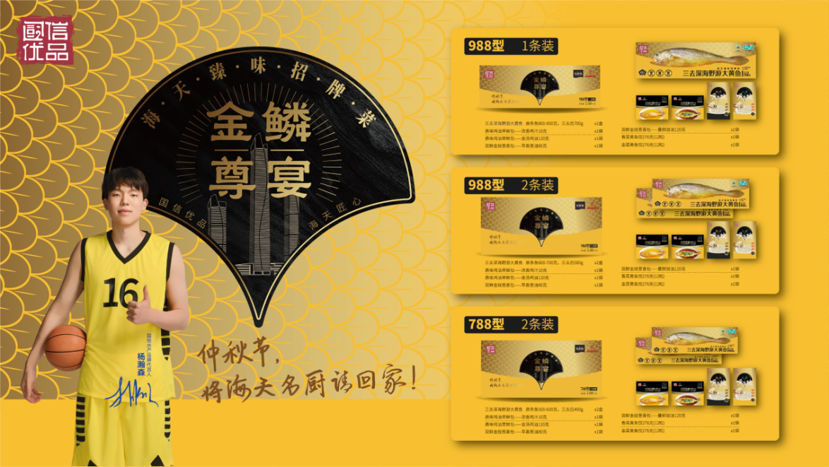 在夯实产品矩阵同时,“国信优品”为这份“严选”品质注入活力与影响力。8月15日,现效力于NBA波特兰开拓者队的中国篮球新星杨瀚森正式成为国信水产品牌代言人,迅速提升了品牌在年轻消费群体中的知名度。此外,中秋到来之际,青岛海天大酒店与国信水产旗下品牌“裕鲜舫”共同推出“金鳞尊宴”联名中秋礼盒,成为品牌破局的又一里程碑。