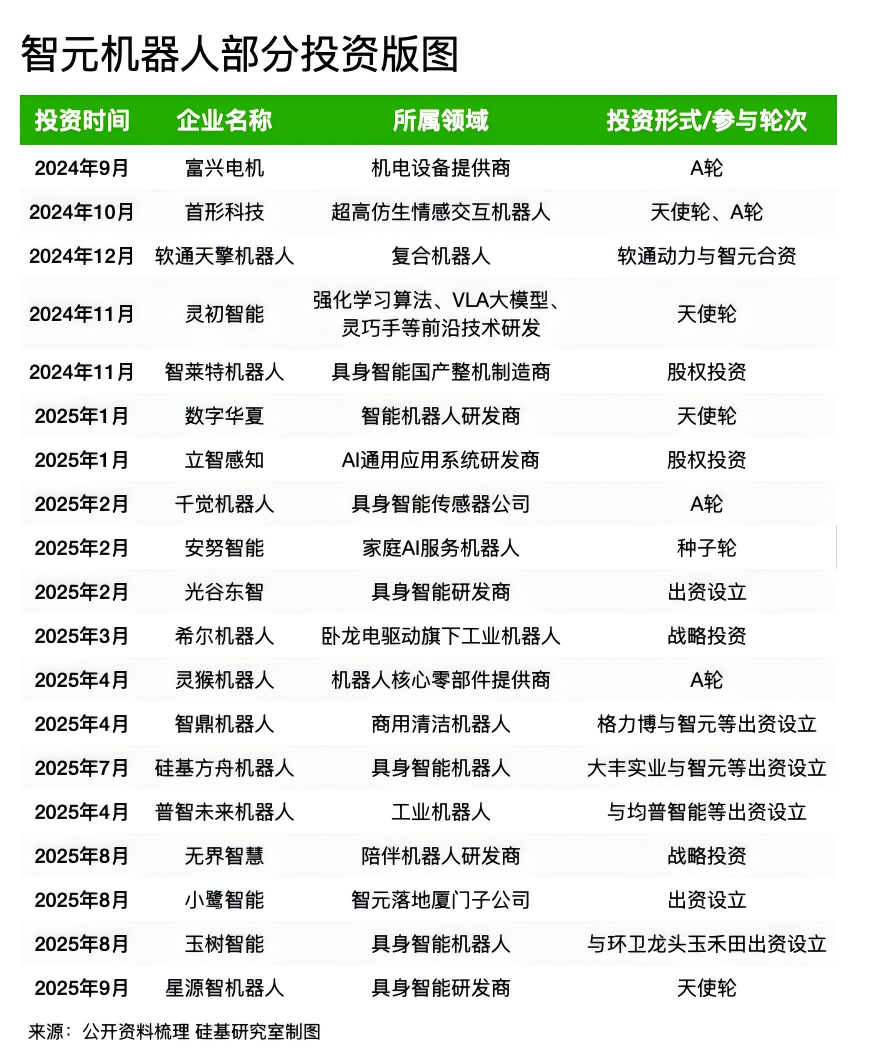 我们关注到,近期智元又参投了一家名为「星源智」的具身智能公司,算上这一笔,据「硅基研究室」不完全统计,智元对外投资已近20笔,既涉及对同行的直接投资,也涉及包括电机、传感器以及下游应用等关键赛道。