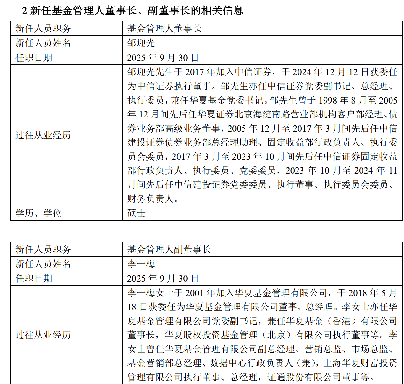 9月30日,华夏基金公告了最新的人事变动,新任董事长为邹迎光、李一梅为副董事长。