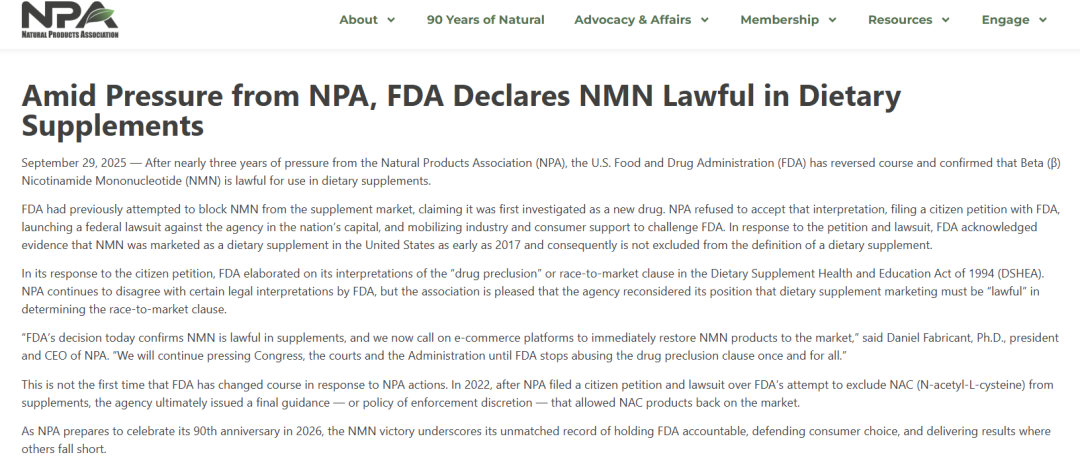 美国时间2025年9月29日,美国天然产品协会(NPA)官网发布消息称,美国食品药品监督管理局(FDA)已正式确认:NMN(β-烟酰胺单核苷酸)作为膳食补充剂销售是合法的。