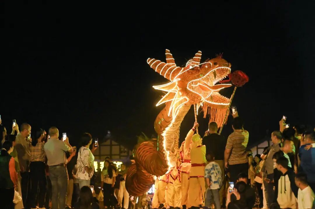 傍晚时分,古镇华灯初上。夜幕降临,平乐古镇的百米竹龙点缀着数百盏七彩LED灯,在月光与古镇灯火的映照下巡游,呈现“鱼龙共舞”的盛景。 与此同时 ,南丝路民谣音乐季的旋律与巡游氛围交织,将狂欢推向高潮。