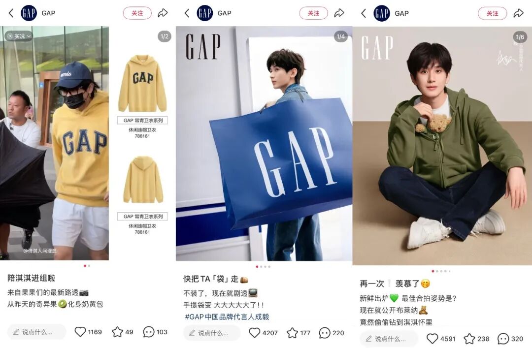 相比之下,小红书则更像GAP的传播场,内容全部围绕代言人、视觉大片等创意性内容展开,明显侧重于更新品牌形象,以及与年轻一代消费者发生交互。
