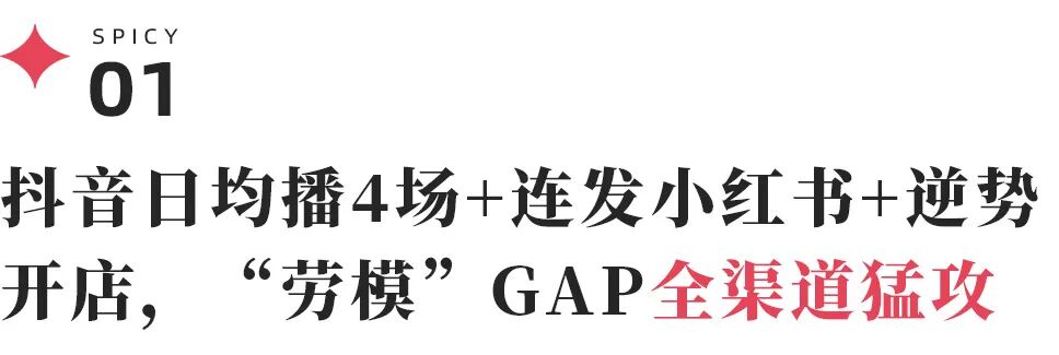 剁椒Spicy观察,抖音、小红书,被GAP赋予不同的鲜明定位,分别承担起销量冲高和品牌传播的重要职能。