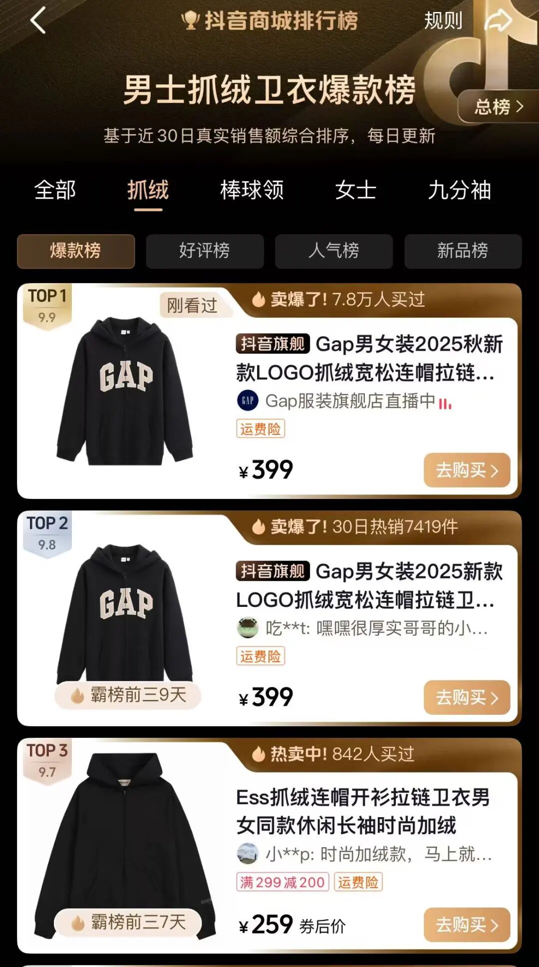 GAP2025秋装卫衣占据抖音爆款榜榜首