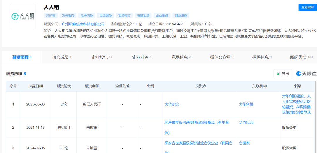 据媒体报道,人人租2021年GMV已经突破30亿元;今年6月,人人租还拿到了大华创投的数亿元融资。“天眼查”数据显示,爱租机在2024年完成了B轮融资,但具体金额未披露。