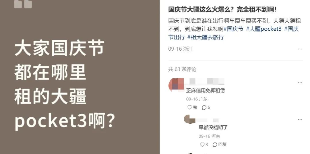 国庆前夕,“一生要出片”的年轻人四处搜寻得力的“拍照搭子”,那些携带方便、滤镜强大的热门相机都在被争先预定;不少网友在社媒平台上吐槽,在租赁平台上找很多商家想租大疆Pocket3,但全都没档期了,“车票买不到,相机现在也这么难租。”
