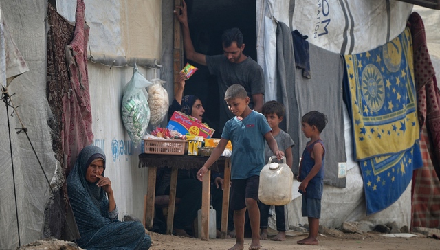 2025年10月6日,加沙地带中部代尔拜拉赫,一处流离失所的巴勒斯坦人帐篷营地,一名妇女在摊位旁照看,一名男孩提着塑料桶走过。来源:视觉中国