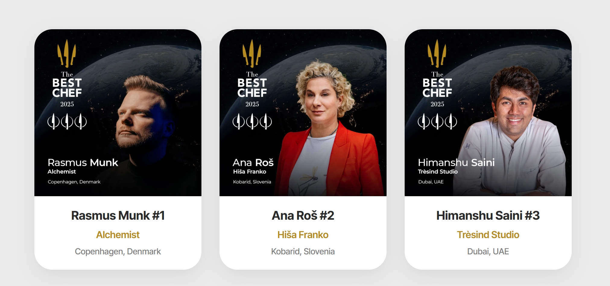 紧随其后的是斯洛文尼亚Hiša Franko餐厅的Ana Roš与阿联酋Trèsind Studio餐厅的Himanshu Saini,分别位列第二、三名。其中,Ana Roš以斯洛文尼亚风土特色为核心,融入全球饮食灵感;Himanshu Saini则以现代烹饪手法重构印度传统料理。