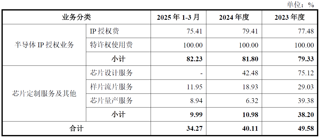 也就是说,锐成芯微芯片量产业务在2023年较高的收入和高毛利率并非真实经营能力的体现。由此,公司整体业务毛利率也受拖累,2023年、2024年和2025年第一季度分别为49.58%、40.11%和34.27%,呈逐年下降态势。