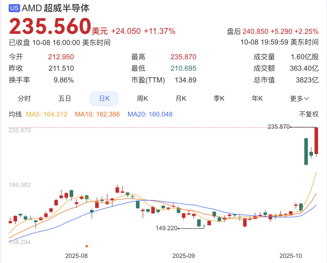 当地时间10月8日,与OpenAI达成数百亿美元合作协议后,芯片巨头AMD股价持续上涨;截至当日收盘,AMD再次大涨11.37%,成交355.35亿美元,股价首次突破230美元新高,总市值3823亿美元。在双方宣布合作后,AMD已经连续三个交易日上涨,三日累计上涨达43%。
