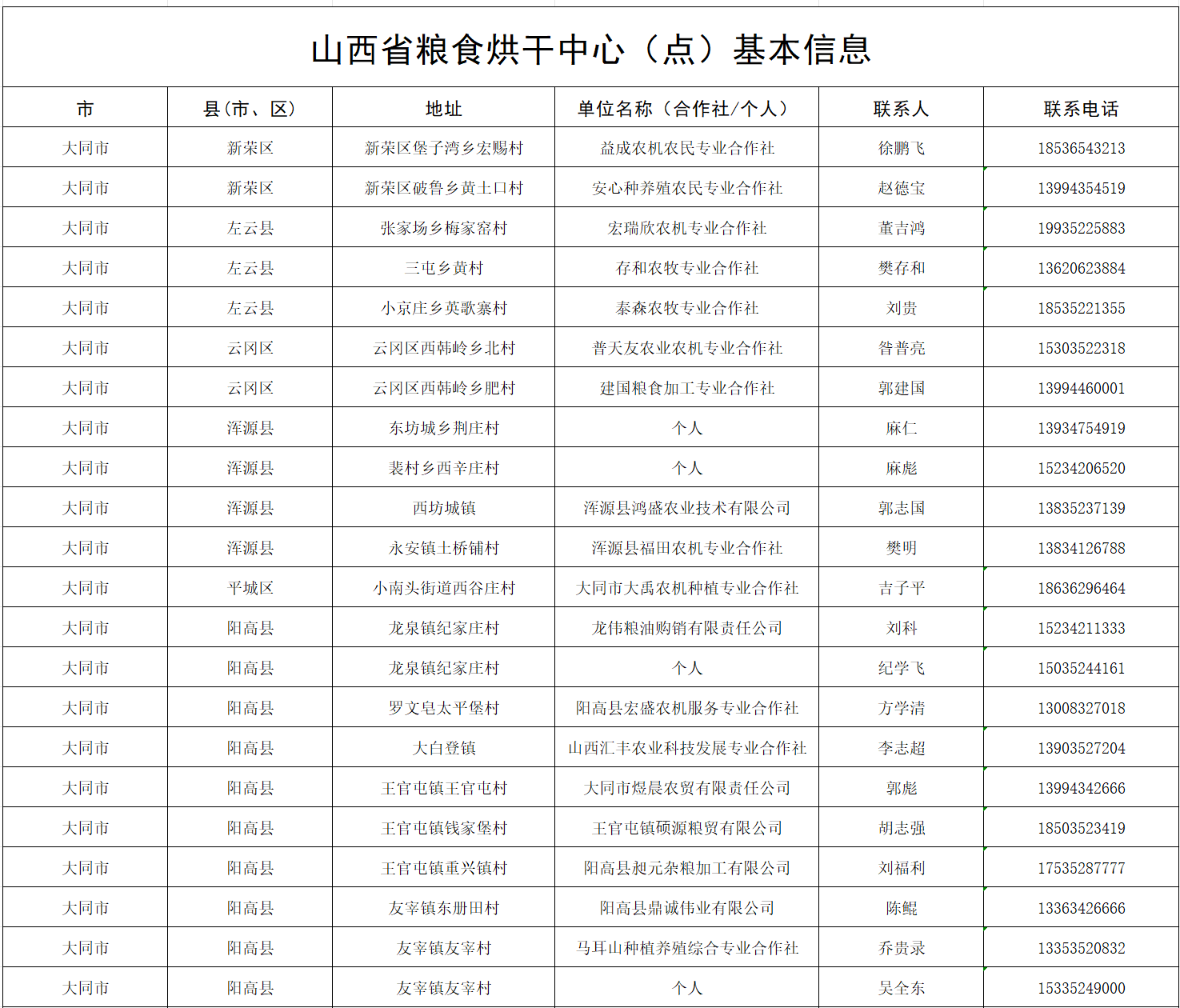 据山西省农业农村厅官方社交平台消息,近日,为应对连日阴雨天气,山西省农业农村厅有效发挥烘干场所作用,及时摸排全省烘干场地及设备底数,提前组织开展机具检修、维修。现将山西省内粮食烘干中心(点)情况进行公布,请有需要的农民朋友就近联系。