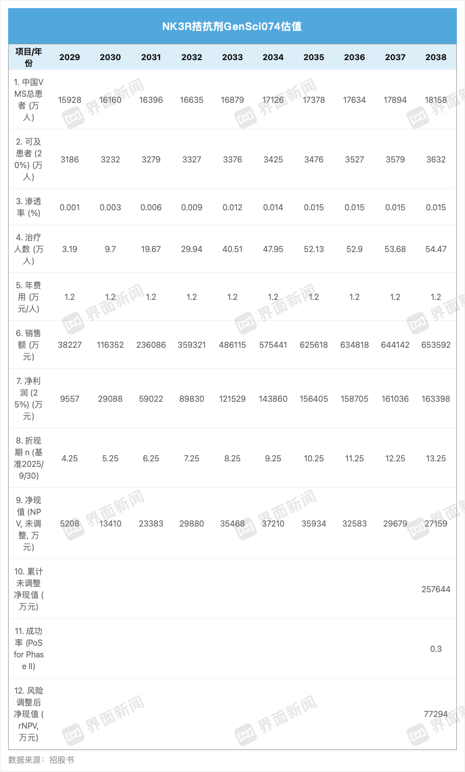 界面新闻同样根据招股书粗略测算,以中国血管舒缩症患者群体规模为基础,考虑Ⅲ期临床推进与NDA审批时间,假设GenSci074最早上市时间约为2029年,这为其留出了约4至5年的研发与注册周期。