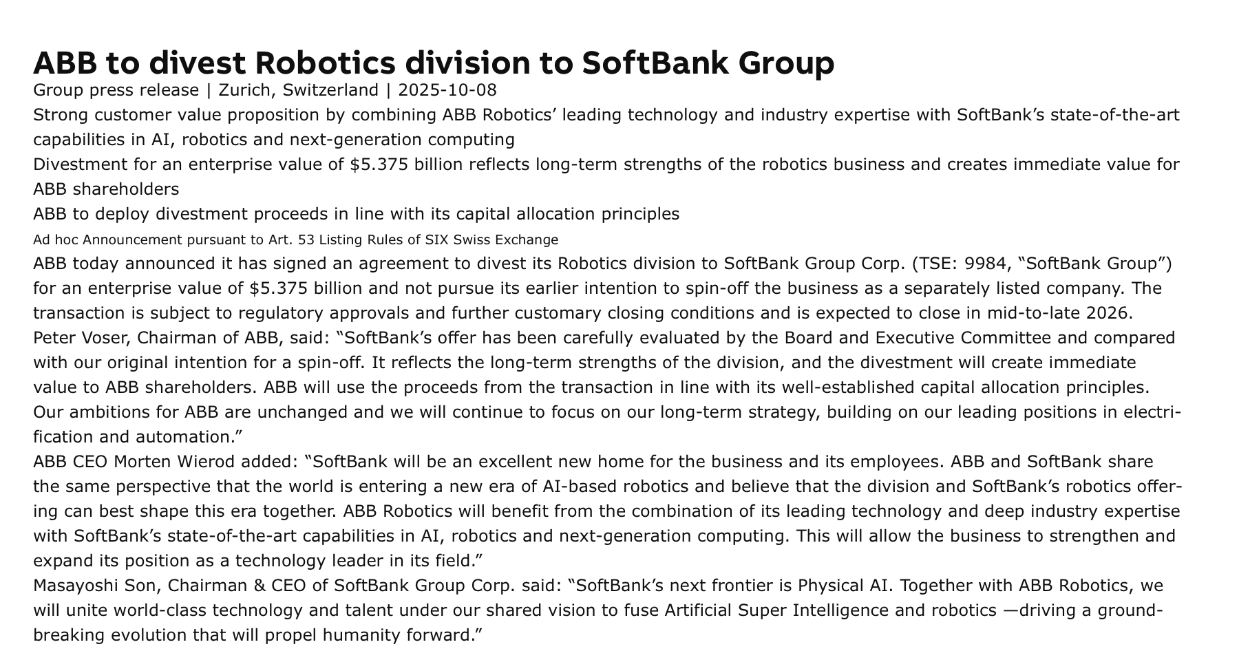 2025年4月,ABB曾宣布拟对机器人业务实施100%分拆,目标是在2026年二季度将其推动为独立上市公司。