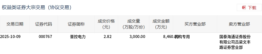 10月9日,晋控电力大宗交易成交3000万股,成交额8460万元,占当日总成交额的44.73%,成交价2.82元,较市场收盘价2.91元折价3.09%。