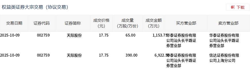 10月9日,天际股份大宗交易成交455万股,成交额8076.25万元,占当日总成交额的2.06%,成交价17.75元,较市场收盘价21.69元折价18.17%。