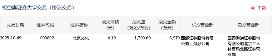 10月9日,北京文化大宗交易成交1700万股,成交额6970万元,占当日总成交额的44.34%,成交价4.1元,较市场收盘价4.44元折价7.66%。