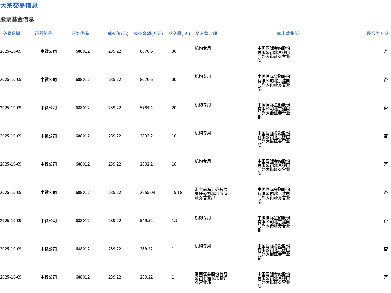 10月9日,中微公司大宗交易成交113.08万股,成交额3.27亿元,占当日总成交额的3.54%,成交价289.22元,较市场收盘价319.11元折价9.37%。