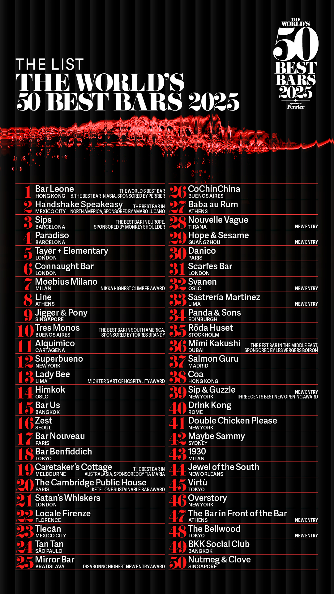 以下是2025年度The World's 50 Best Bars“世界50最佳酒吧”完整榜单