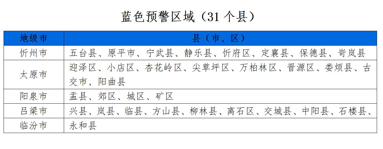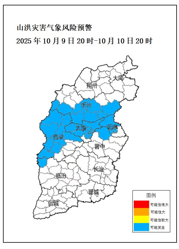 据山西省气象局消息,山西省水利厅和山西省气象局2025年10月9日17时00分联合发布山洪灾害气象风险预警:2025年10月9日20时至10月10日20时,受强降雨影响,山西省忻州、太原、阳泉中部和北部、吕梁北部和西部、临汾西北部5个市31个县可能发生山洪(蓝色预警)。