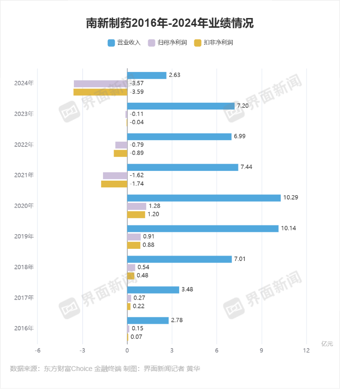 2021年到2024年,南新制药的营收为7.44亿元、6.99亿元、7.2亿元、2.63亿元;归母净利润为-1.62亿元、-0.79亿元、-0.11亿元、-3.57亿元。