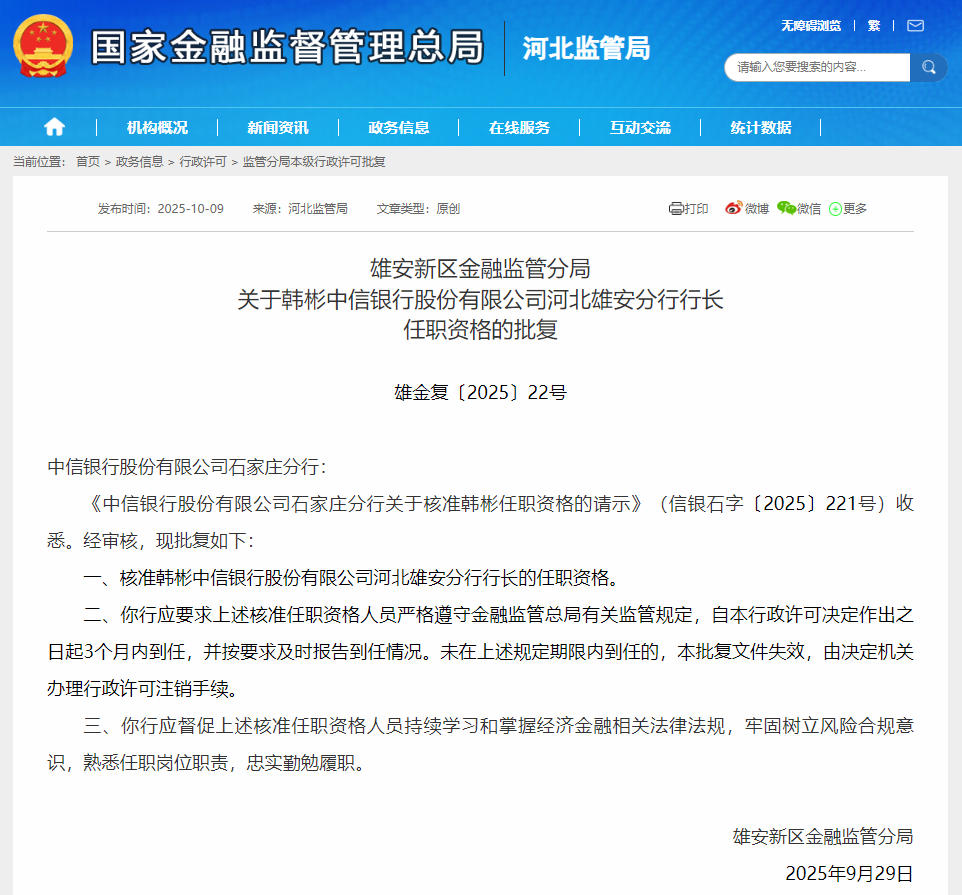 据国家金融监督管理总局河北监管局的批复文件显示,雄安新区金融监管分局核准韩彬中信银行河北雄安分行行长的任职资格。