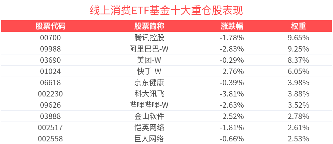 数据显示,截至2025年9月30日,中证沪港深线上消费主题指数(931481)前十大权重股分别为阿里巴巴-W(09988)、腾讯控股(00700)、快手-W(01024)、美团-W(03690)、京东健康(06618)、巨人网络(002558)、哔哩哔哩-W(09626)、科大讯飞(002230)、恺英网络(002517)、昆仑万维(300418),前十大权重股合计占比55.76%。