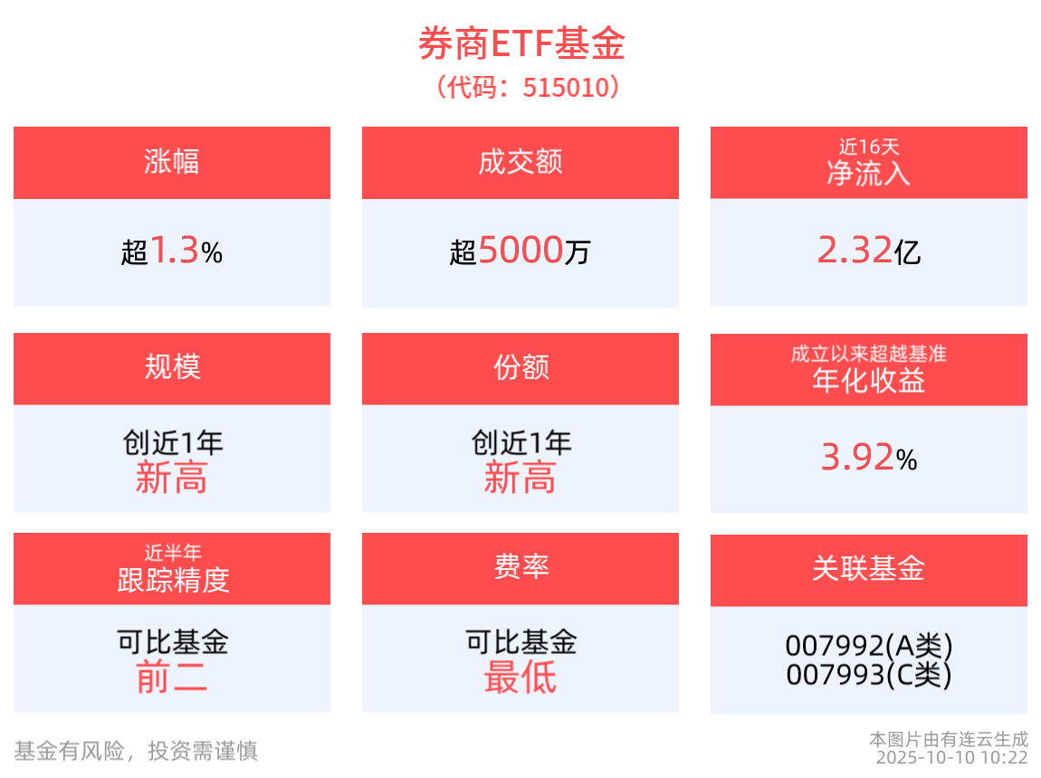 统计显示,券商ETF基金(515010)近16个交易日内有12日资金净流入,合计“吸金”2.32亿元。截至10月9日,券商ETF基金最新份额达12.42亿份,最新规模达17.99亿元,均创成立以来新高。