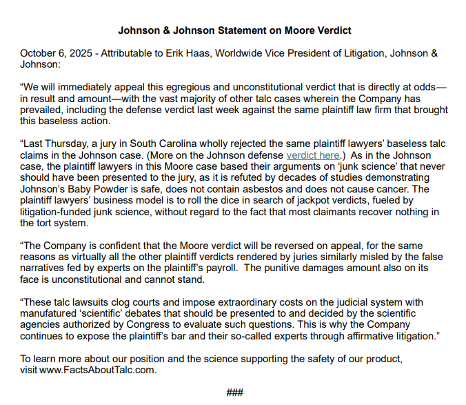 对于这一判决结果,强生公司并不认同,并明确表示将提出上诉。强生公司全球诉讼事务副总裁Erik Haas在一份声明中表示,公司计划立即上诉,称该判决“荒谬且不合法”。同时,他还指控原告律师在Moore案中“引用了不应被提交给陪审团的伪科学证据”。
