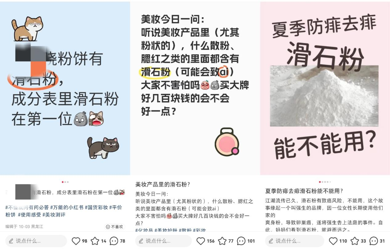 例如,在小红书等社交平台上,不少用户公开表达对粉饼、腮红等彩妆产品中所含滑石粉的担忧,“粉饼、腮红、散粉的成分表中,滑石粉排在第一位,会不会有致癌风险?”“买大牌的含滑石粉产品,安全性会不会好一点?”此类疑问的背后,是消费者对滑石粉类产品的集体信任焦虑。