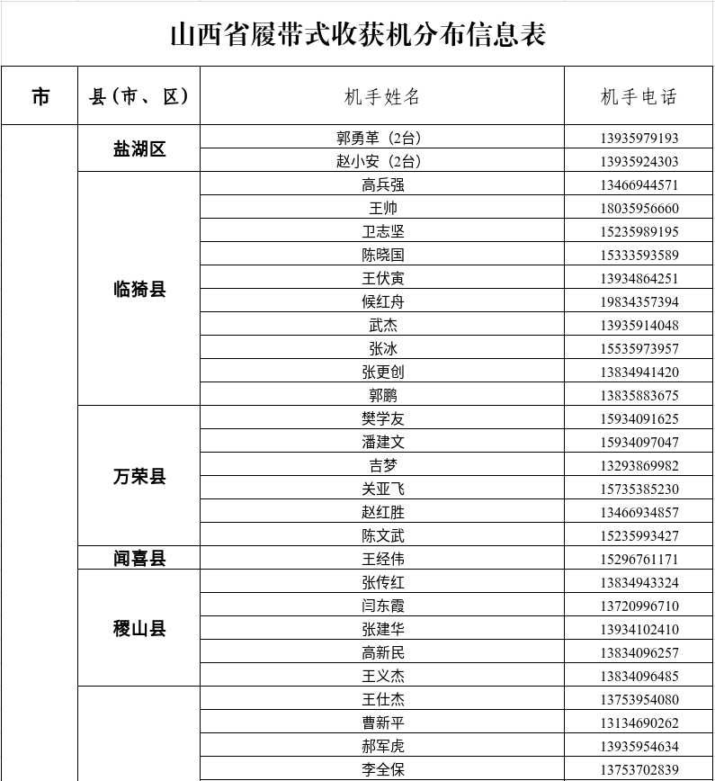 据山西农业农村厅官方社交平台消息,为充分发挥履带式收割机应对阴雨天气抢收效能,确保能收尽收,颗粒归仓。山西省农业农村厅在公布烘干中心(点)的基础上,加紧对全省履带式收割机进行了摸排,并提前组织开展了机具检修。现将全省履带式收割机保有情况予以公布,方便有需求的农户就近联系调度。