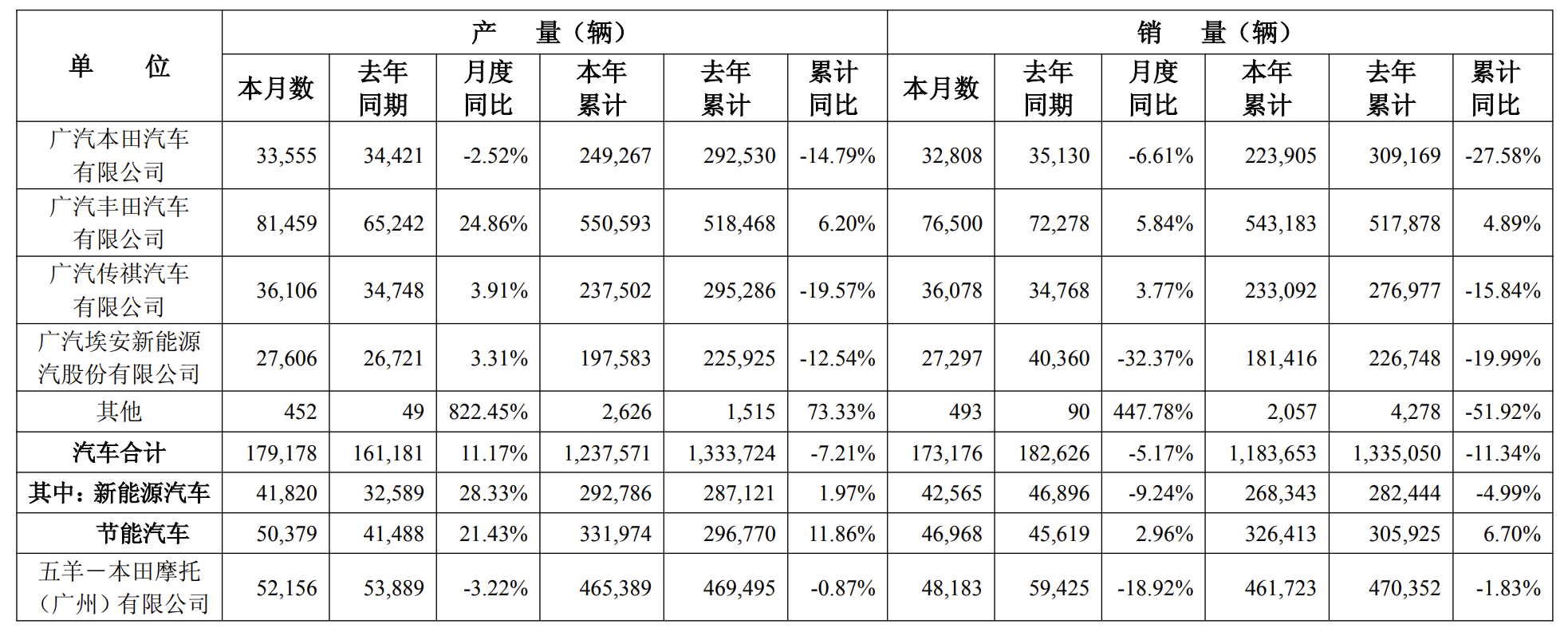 广汽集团10月10日晚间公告,2025年9月汽车销量为173,176辆,同比下降5.17%,本年累计销量为1,183,653辆,同比下降11.34%。
