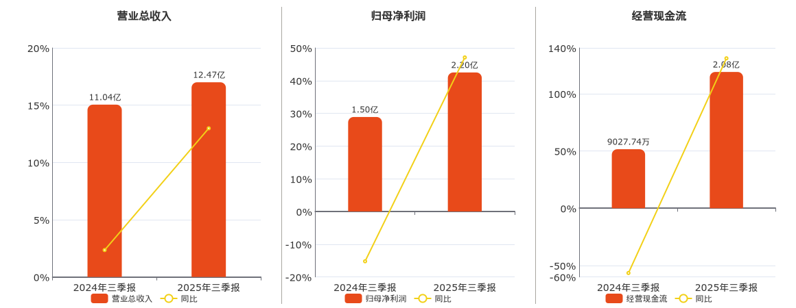公司营业总收入为12.47亿元,较去年同报告期营业总收入增加1.43亿元,实现2年连续上涨,同比较去年同期上涨12.98%。归母净利润为2.20亿元,较去年同报告期归母净利润增加7058.39万元,同比较去年同期上涨47.09%。经营活动现金净流入为2.08亿元,较去年同报告期经营活动现金净流入增加1.18亿元,同比较去年同期上涨130.91%。