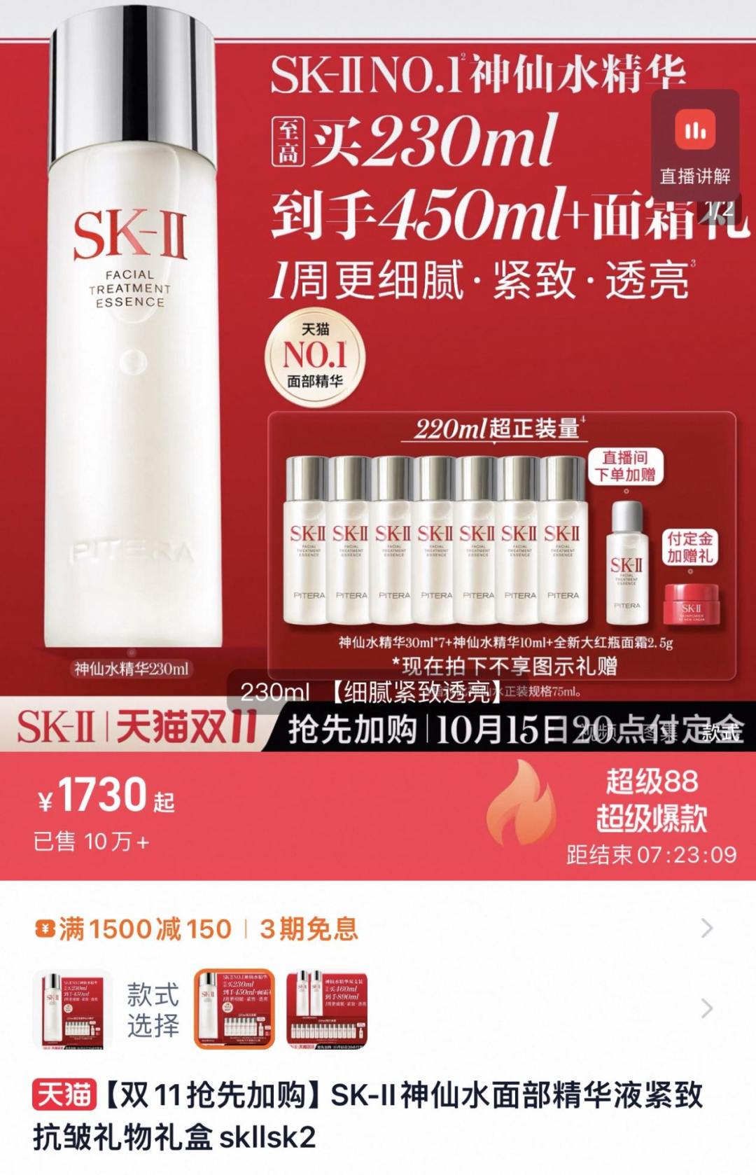 今年618期间,SK-II成为李佳琦直播间预售首日商品成交总额过亿的五个品牌之一,据天猫618全周期美妆品牌排行榜,SK-II从去年同期的第8名上升至第7名。