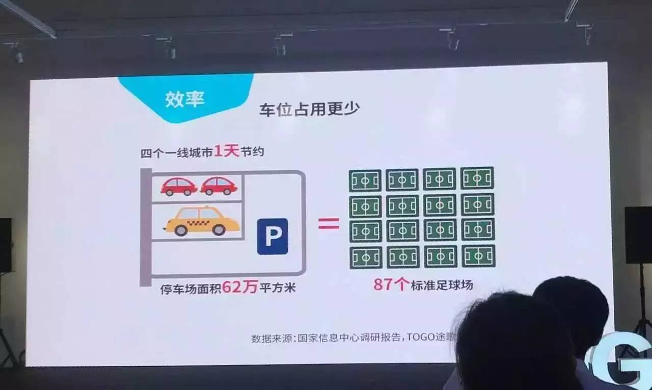 “因此,途歌等共享汽车平台应运而生。”途歌CEO王利峰说:“在缓解停车难方面,在北京、上海、深圳、广州四个一线城市,平均每天因共享汽车节约的停车场面积达到33万平方米,相当于46个标准足球场。”