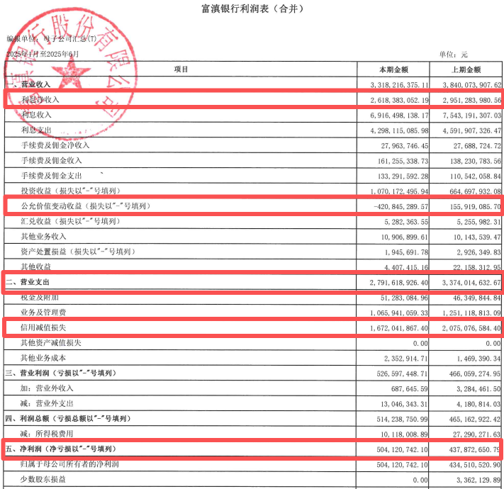 图 / 富滇银行2025年上半年利润表(来源:富滇银行2025年第二季度报告)
