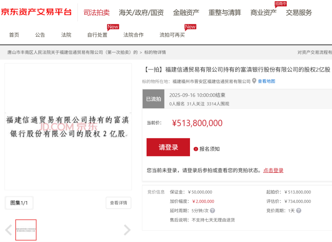 图 / 富滇银行2亿股股权遭流拍(来源:京东拍卖平台)