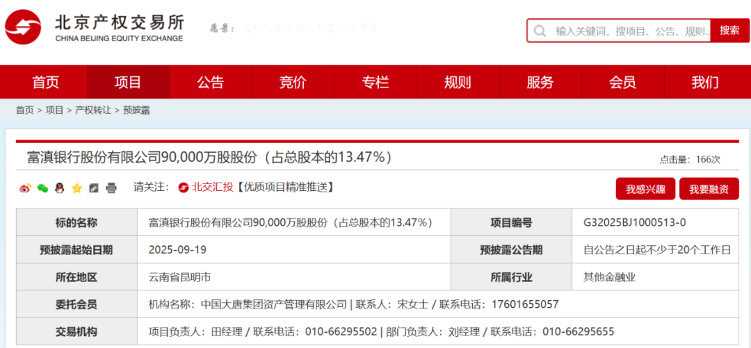 此后在9月19日,据北京产权交易所预披露信息显示,作为该行第二大股东的中国大唐集团财务有限公司(简称“大唐财务”),拟挂牌转让其持有的富滇银行9亿股股份,占该行总股本的13.47%。