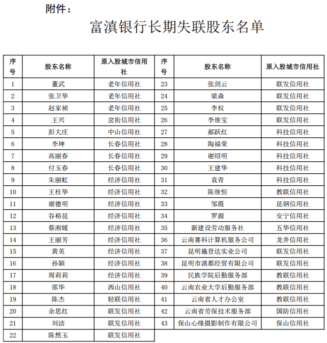 今年6月,富滇银行发布公告称,失联股东包括34名个人股股东和9名法人股股东,他们的入股时间大多是在1996年12月31日。