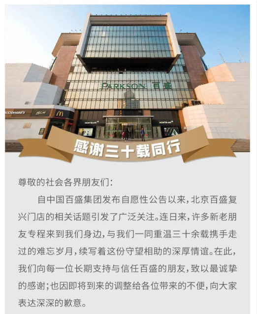 10月10日,北京百盛发布公告称,北京百盛复兴门店将于2025年12月31日关闭。对于闭店原因,公司解释,百盛集团正全面推进一场积极而全面的战略转型,对于受限于客观条件、难以在复合需求上实现均衡发展的门店,经过慎重评估不得不做出艰难但必要的决定。