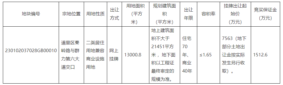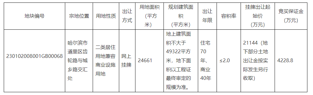 黑龙江省公共资源交易中心于国庆假期前挂牌两宗位于道里区的住宅用地,分别位于齿轮路与城乡路交汇处、秦岭路与群力第六大道交口,总出让面积超过3.7万平方米,两地块均计划于11月3日竞拍。