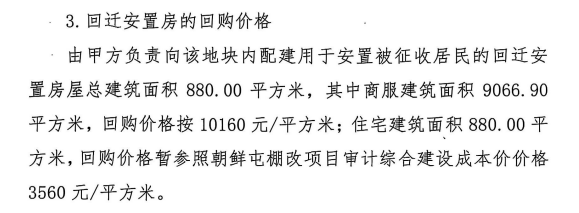 在回购价格方面,商服按10160元/平方米计算,住宅部分回购价格暂参照朝鲜屯棚改项目审计综合建设成本价3560元/平方米。