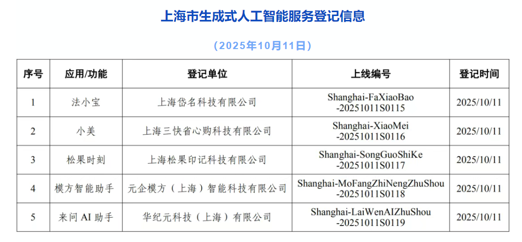 10月11日,据“网信上海”微信公众号消息,截至10月11日,上海市新增5款已完成登记的生成式人工智能服务,累计已完成119款生成式人工智能服务登记。
