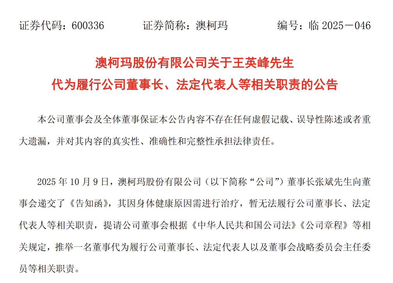 根据澳柯玛发布的官方公告,2025年10月9日,张斌向董事会递交《告知函》,明确因健康治疗需求,申请暂离董事长、法定代表人及董事会战略委员会主任委员等岗位。董事会随后召开会议,决定由现任董事、总经理王英峰代为履行相关职责。