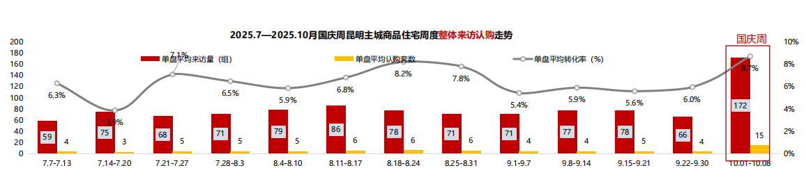 据克而瑞发布的数据显示,国庆期间昆明楼市迎来一波小高峰,整体来访、成交双双上涨。总成交1055套,同比上涨19%;总体来访12371组,同比上涨51%。